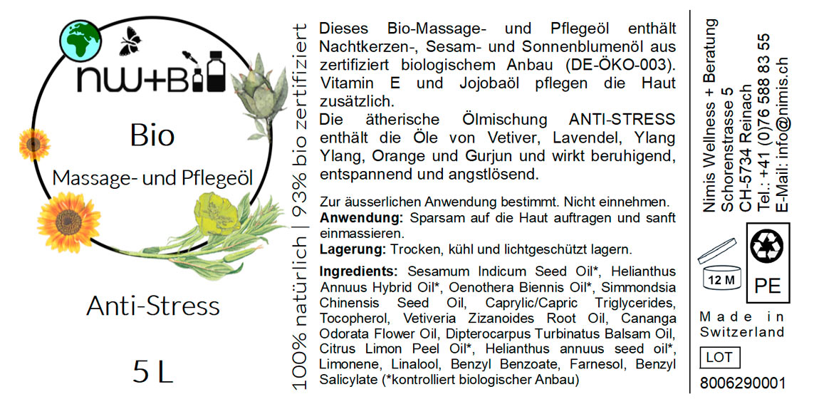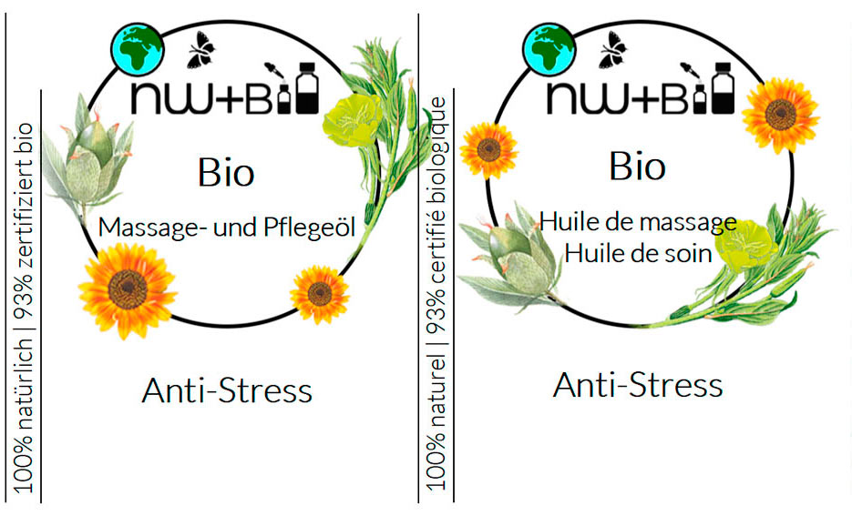 Inhaltsstoffe: Bio-Sesamöl, Bio-Sonnenblumenöl High Oleic, Bio-Nachtkerzenöl, ätherische Ölmischung Anti-Stress, Jojobaöl, MCT-Öl, Vitamin E natürlich