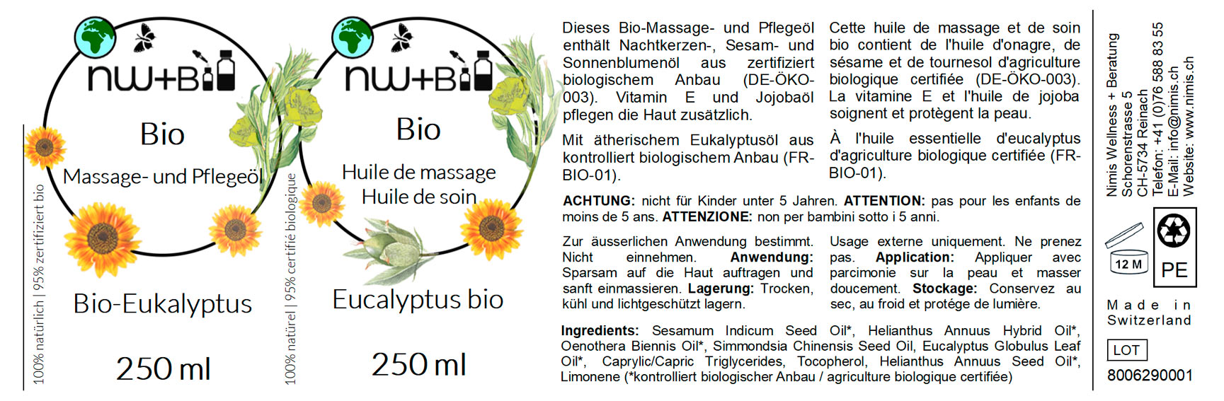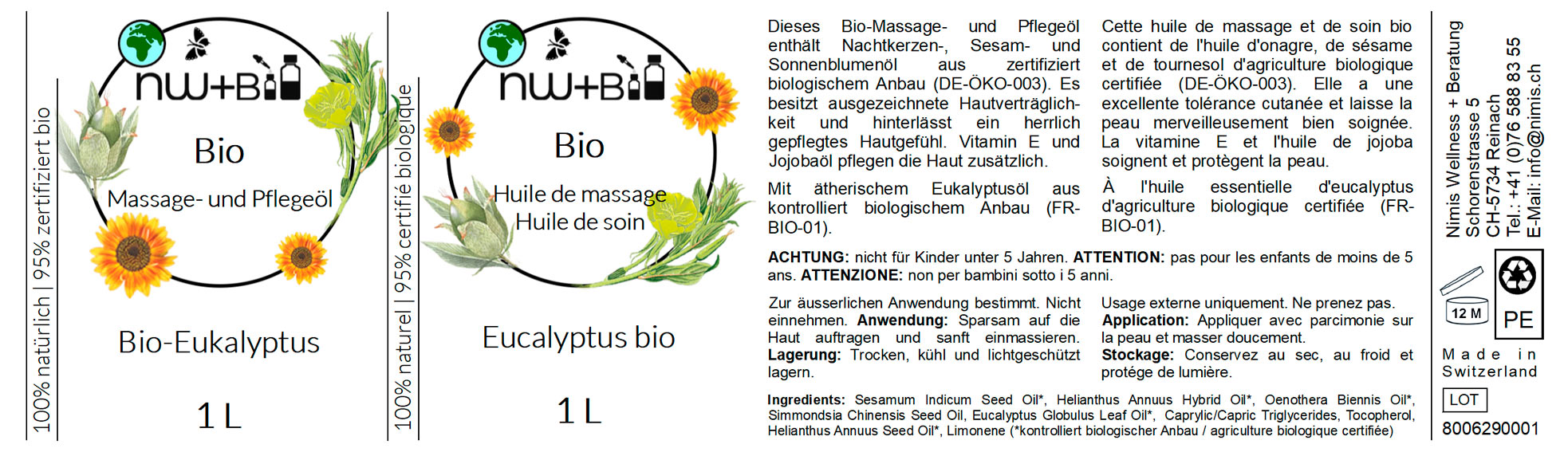 BIO Massage- und Pflegeöl Eukalyptus EO BIO enthält Nachtkerzen-, Sesam- und Sonnenblumenöl aus kontrolliert biologischem Anbau (DE-ÖKO-003).