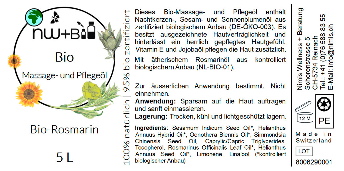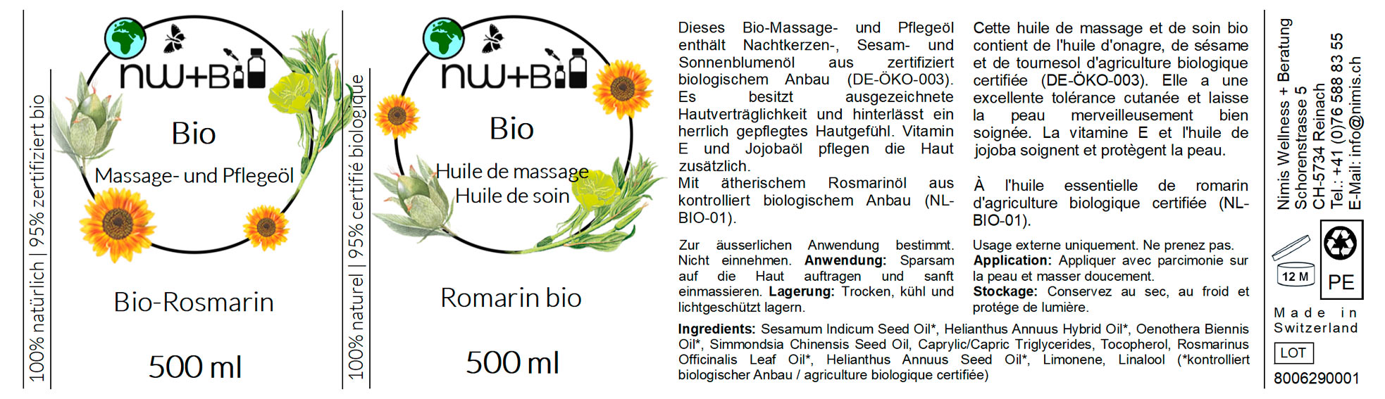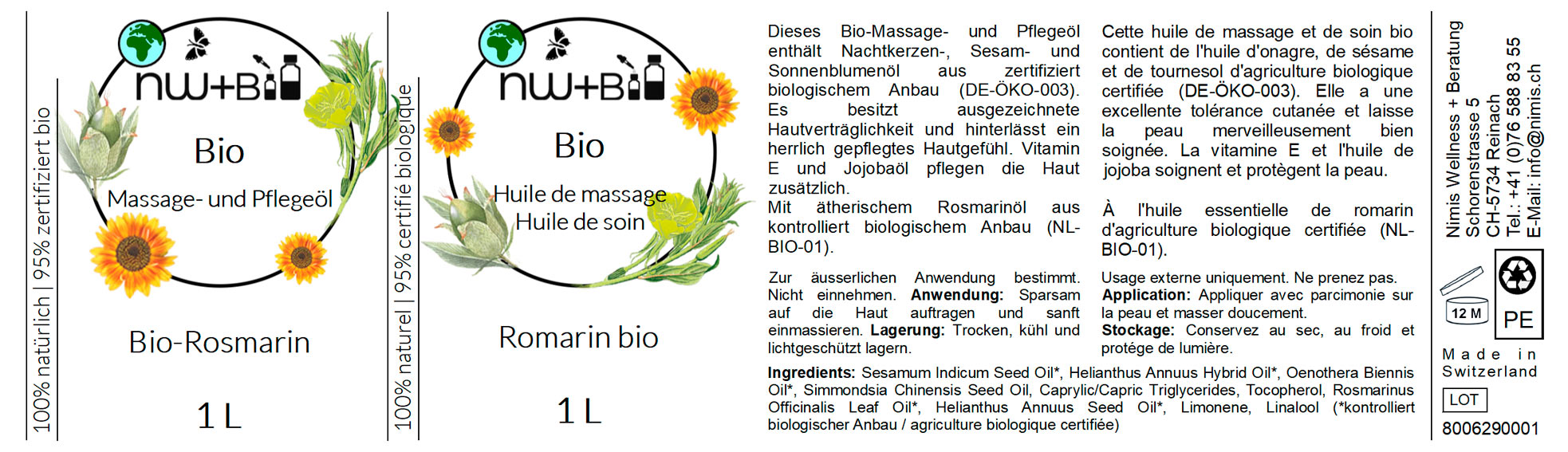 BIO Massage- und Pflegeöl Rosmarin EO BIO enthält Nachtkerzen-, Sesam- und Sonnenblumenöl aus kontrolliert biologischem Anbau (DE-ÖKO-003).