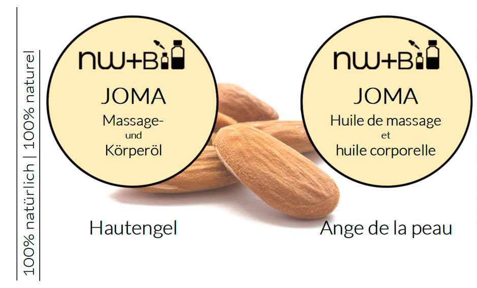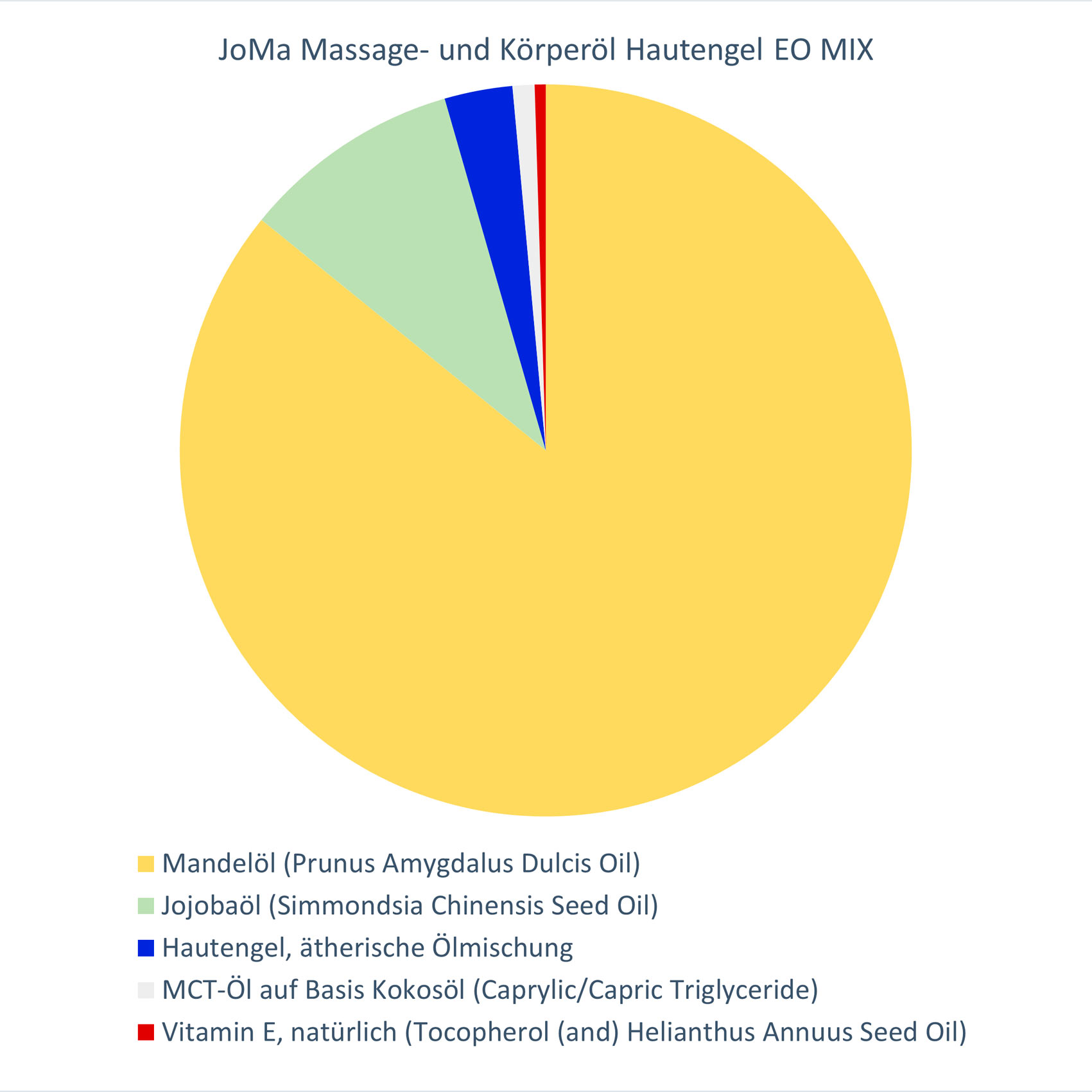 JoMa Massage- und Körperöl Hautengel EO MIX enthält Mandelöl und Jojobaöl in medizinischer Qualität (Ph. Eur.) und besitzt hervorragende Hautverträglichkeit und Griffsicherheit.