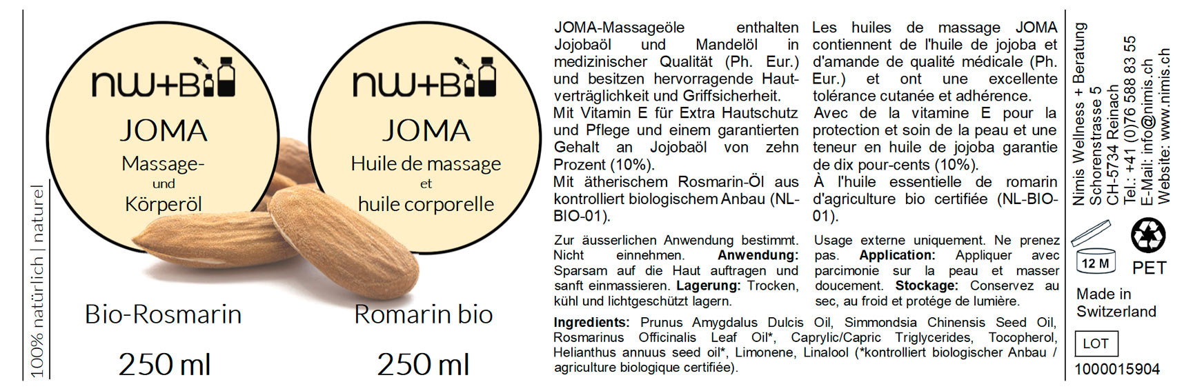JoMa Massage- und Körperöl Rosmarin EO BIO enthält Mandelöl und Jojobaöl in medizinischer Qualität (Ph. Eur.) und besitzt hervorragende Hautverträglichkeit und Griffsicherheit.