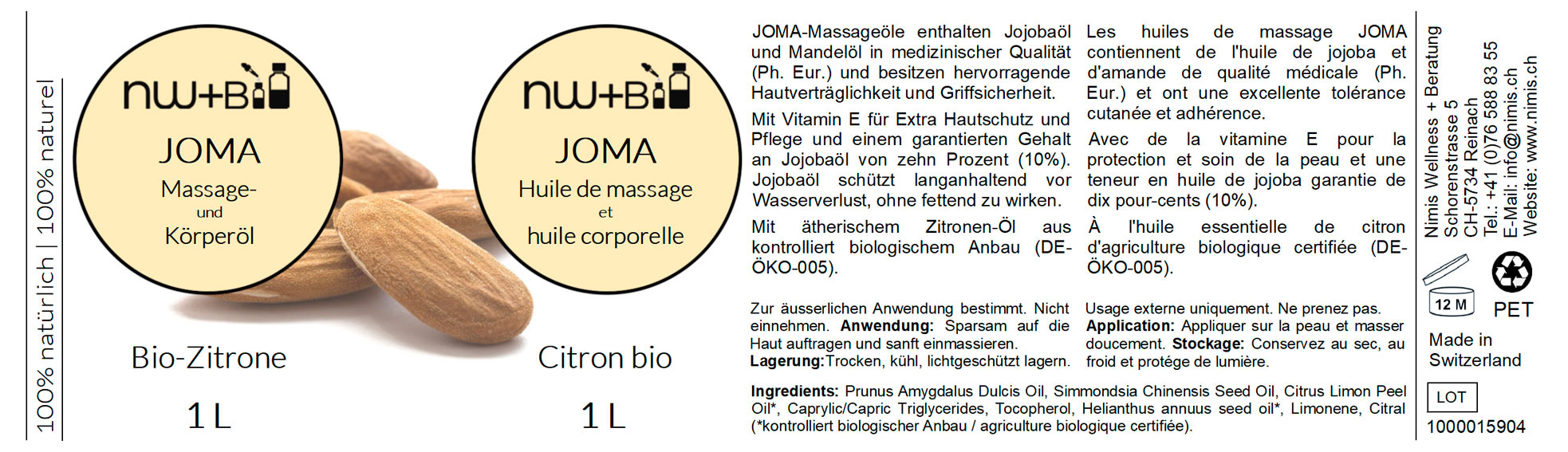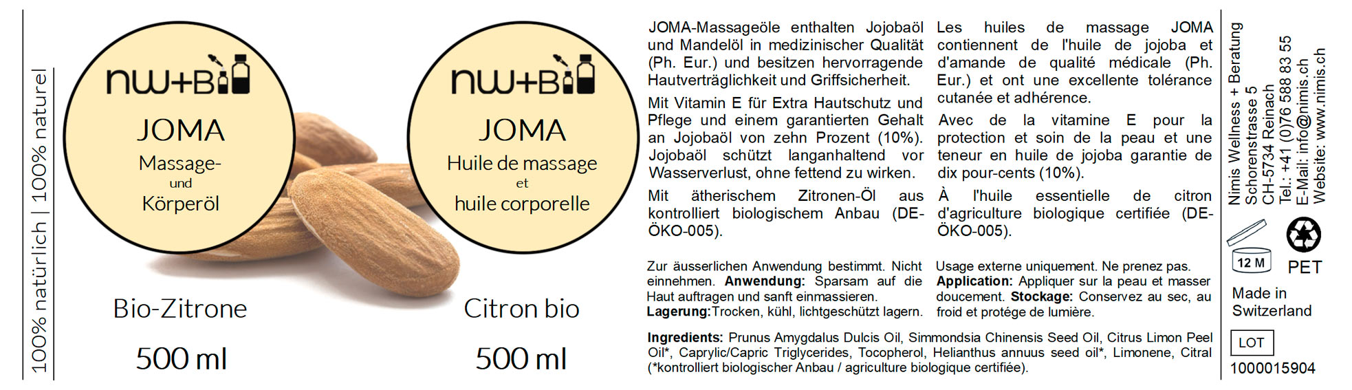 JoMa Massage- und Körperöl Zitrone EO BIO enthält Mandelöl und Jojobaöl in medizinischer Qualität (Ph. Eur.) und besitzt hervorragende Hautverträglichkeit und Griffsicherheit.