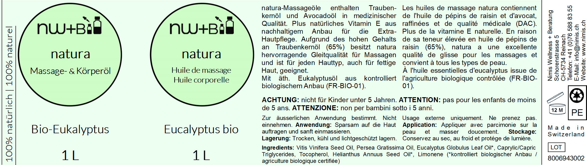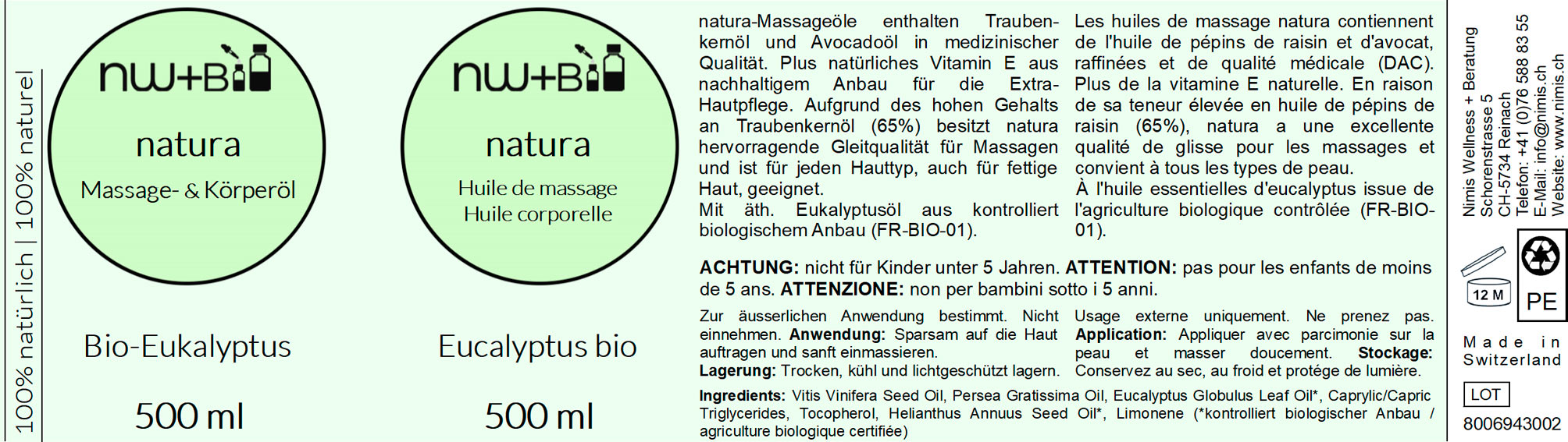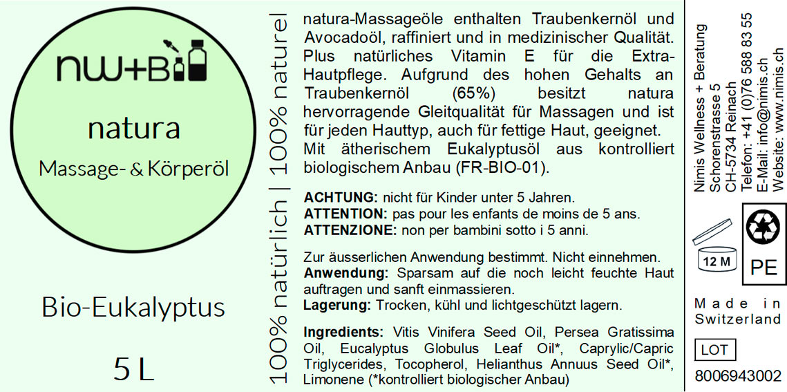 Mit ätherischem Bio-Eukalyptusöl aus kontrolliert biologischem Anbau (FR-BIO-01). Allgemein anerkannt ist die Anwendung des Eukalyptusöls als durchblutungsförderndes Mittel und lösende Einreibung.