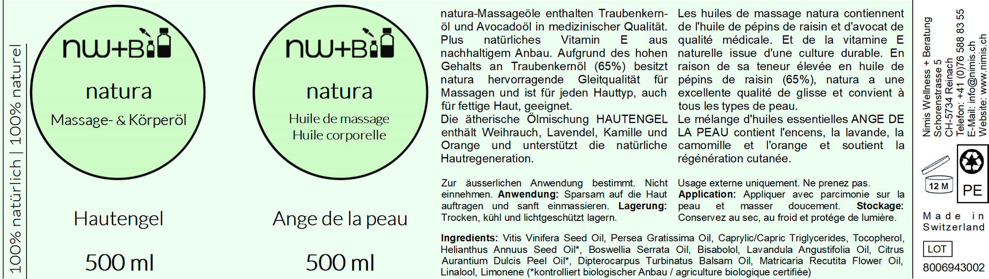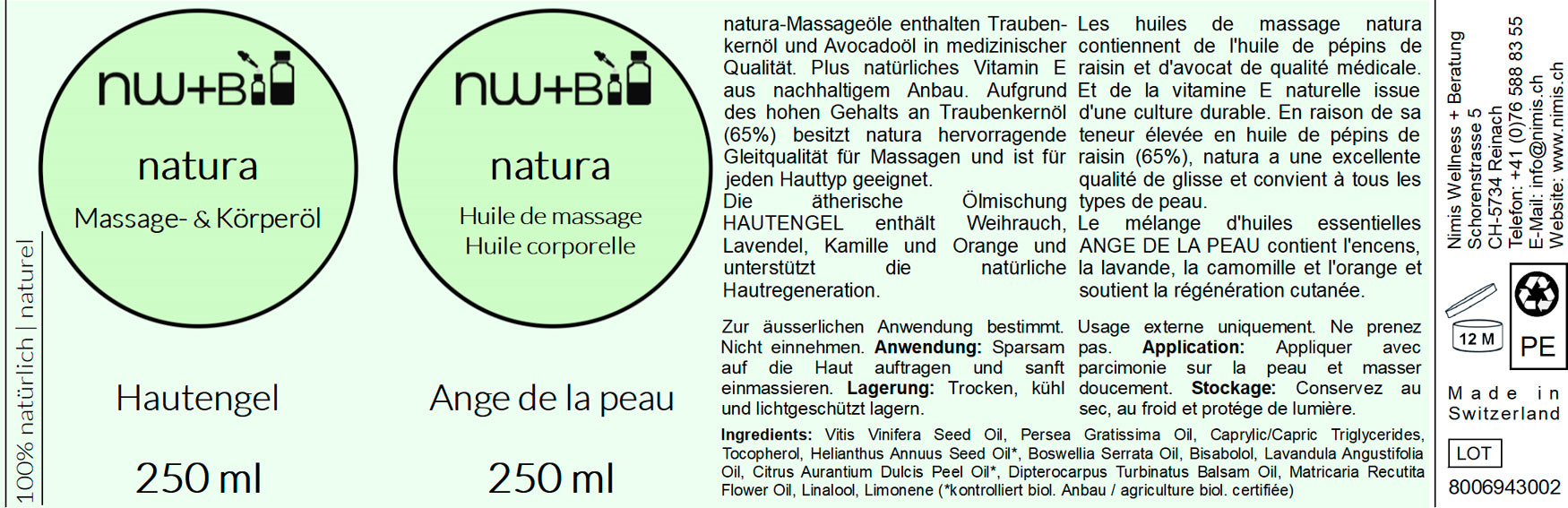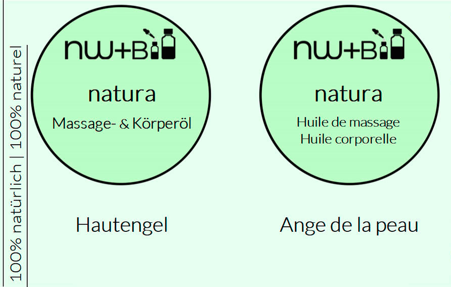 natura-Massage- und Körperöle enthalten Traubenkernöl und Avocadoöl in medizinischer Qualität entsprechend dem Deutschen Arzneimittel-Codex (DAC) sowie natürliches Vitamin E aus nachhaltigem Anbau für die Extra-Hautpflege.