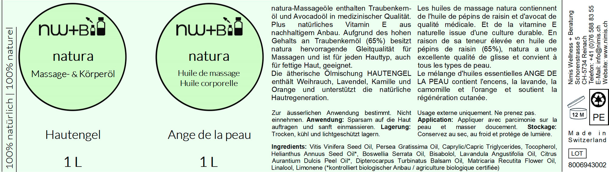 Aufgrund des hohen Gehalts an Traubenkernöl (65%) besitzt natura hervorragende Gleitqualität für Massagen und ist für jeden Hauttyp, auch für fettige Haut, geeignet. Die Kombination mit Avocadoöl macht natura auch für trockene und reife Haut geeignet. Vitamin E pflegt die Haut zusätzlich, schützt vor freien Radikalen und vor Austrocknung.