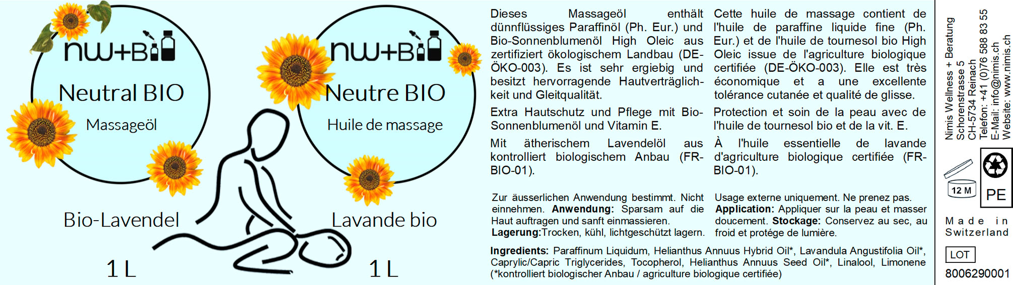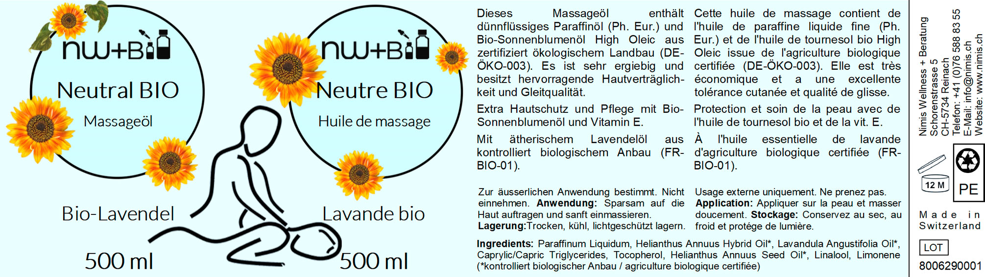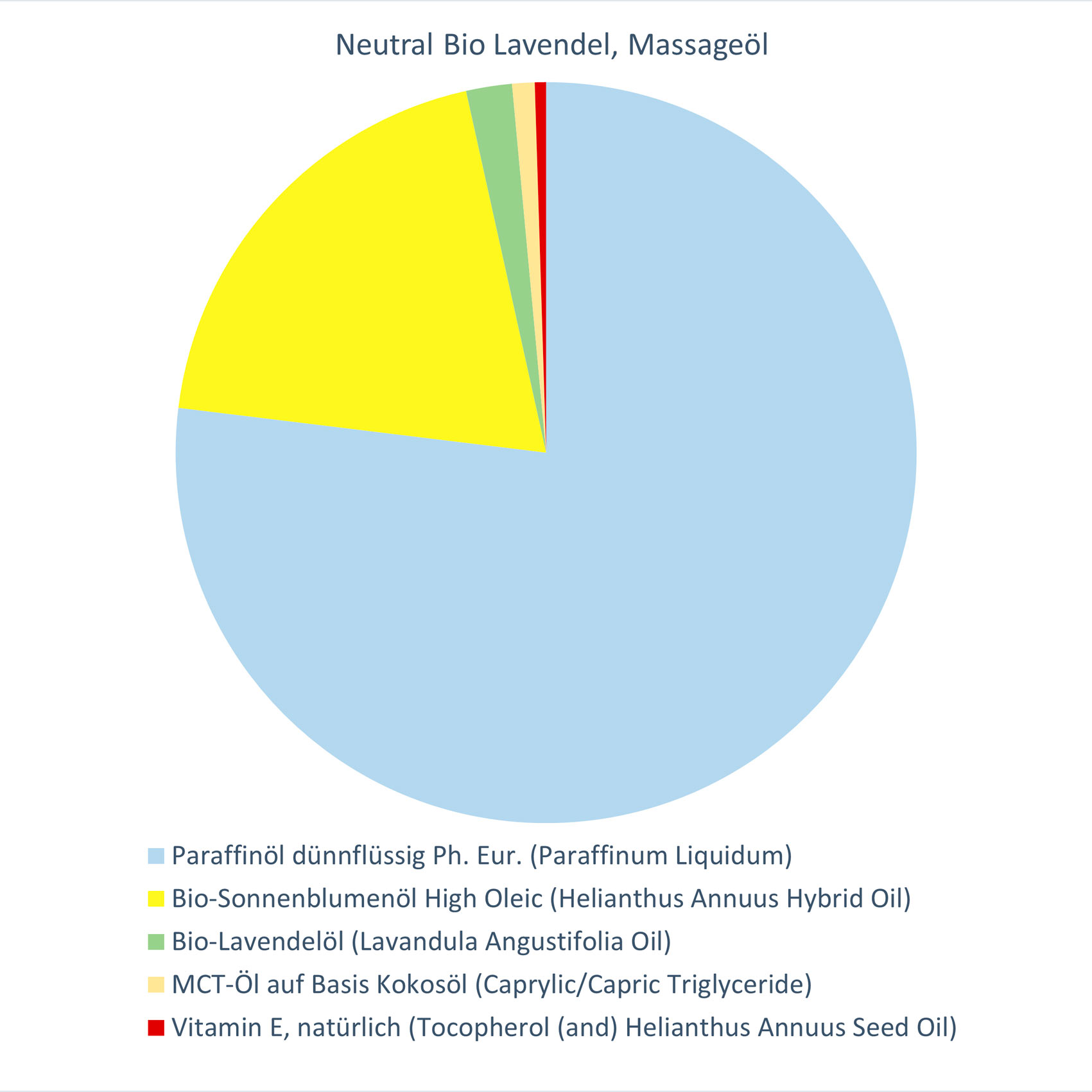 Dieses Massageöl enthält dünnflüssiges Paraffinöl (Ph. Eur.) und Bio-Sonnenblumenöl High Oleic aus zertifiziert ökologischem Landbau (DE-ÖKO-003). Es ist sehr ergiebig und besitzt hervorragende Hautverträglichkeit und Gleitqualität.