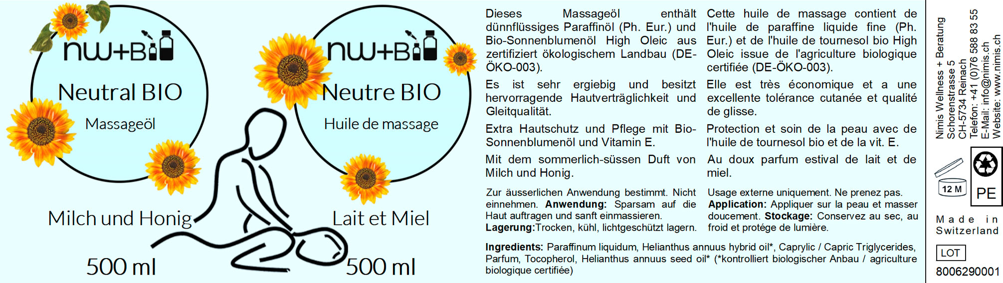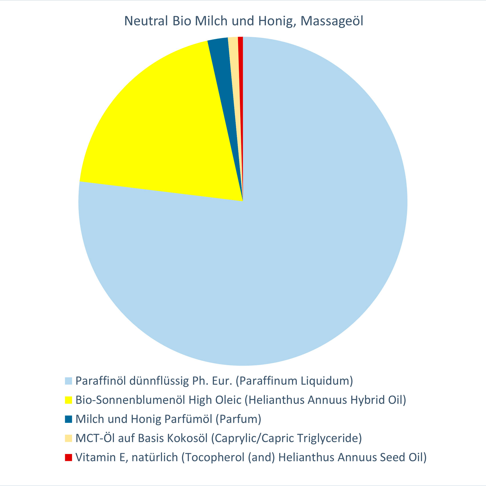 Inhaltsstoffe: Paraffinöl dünnflüssig, Bio-Sonnenblumenöl High Oleic, Milch und Honig-Parfümöl, MCT-Öl, Vitamin E natürlich