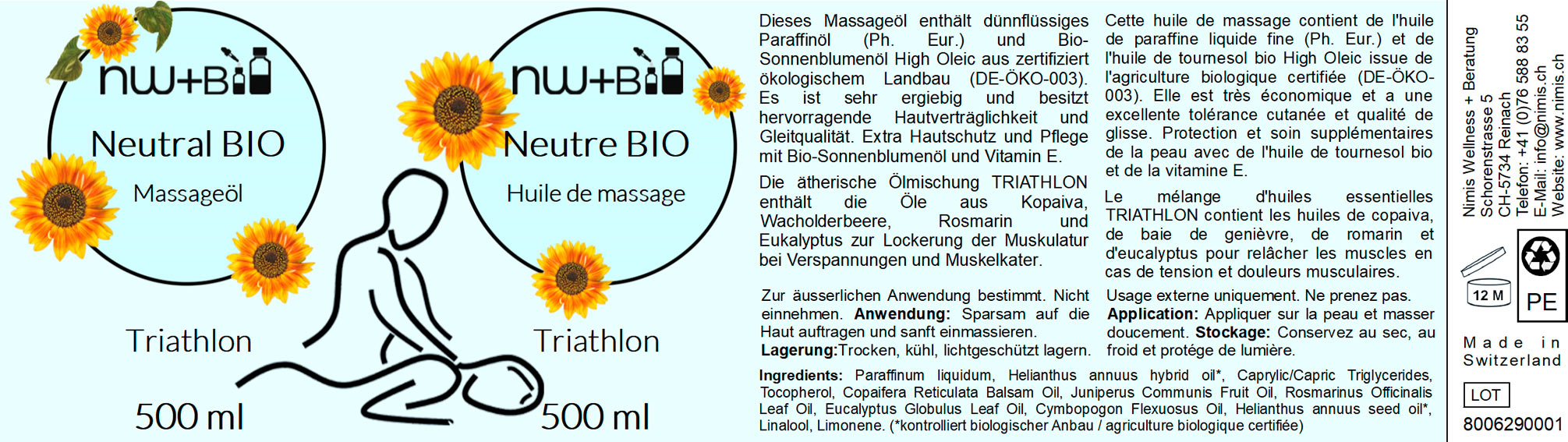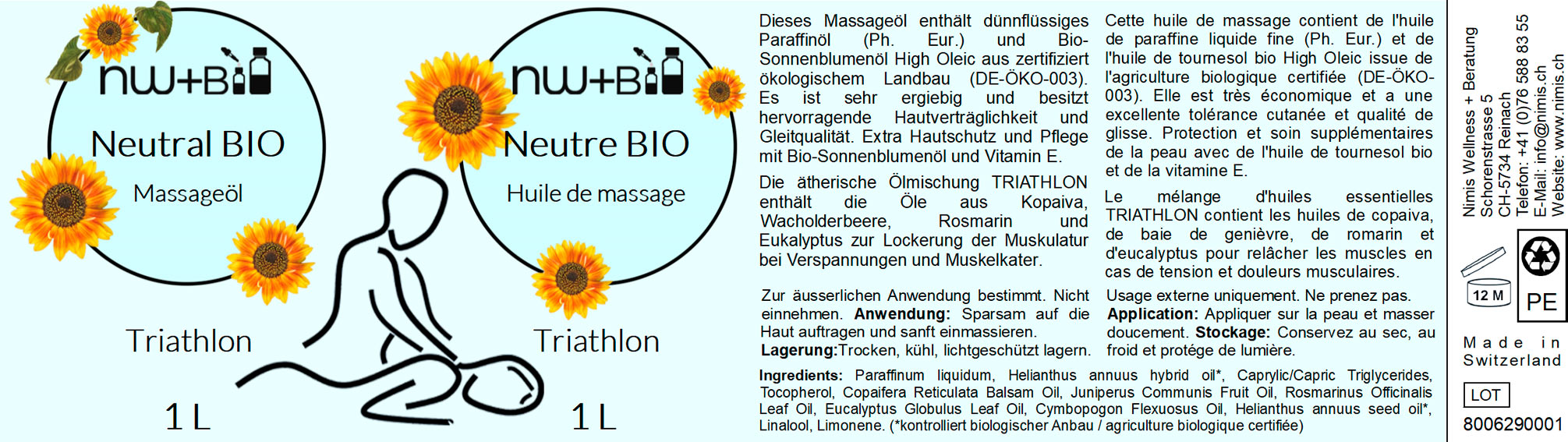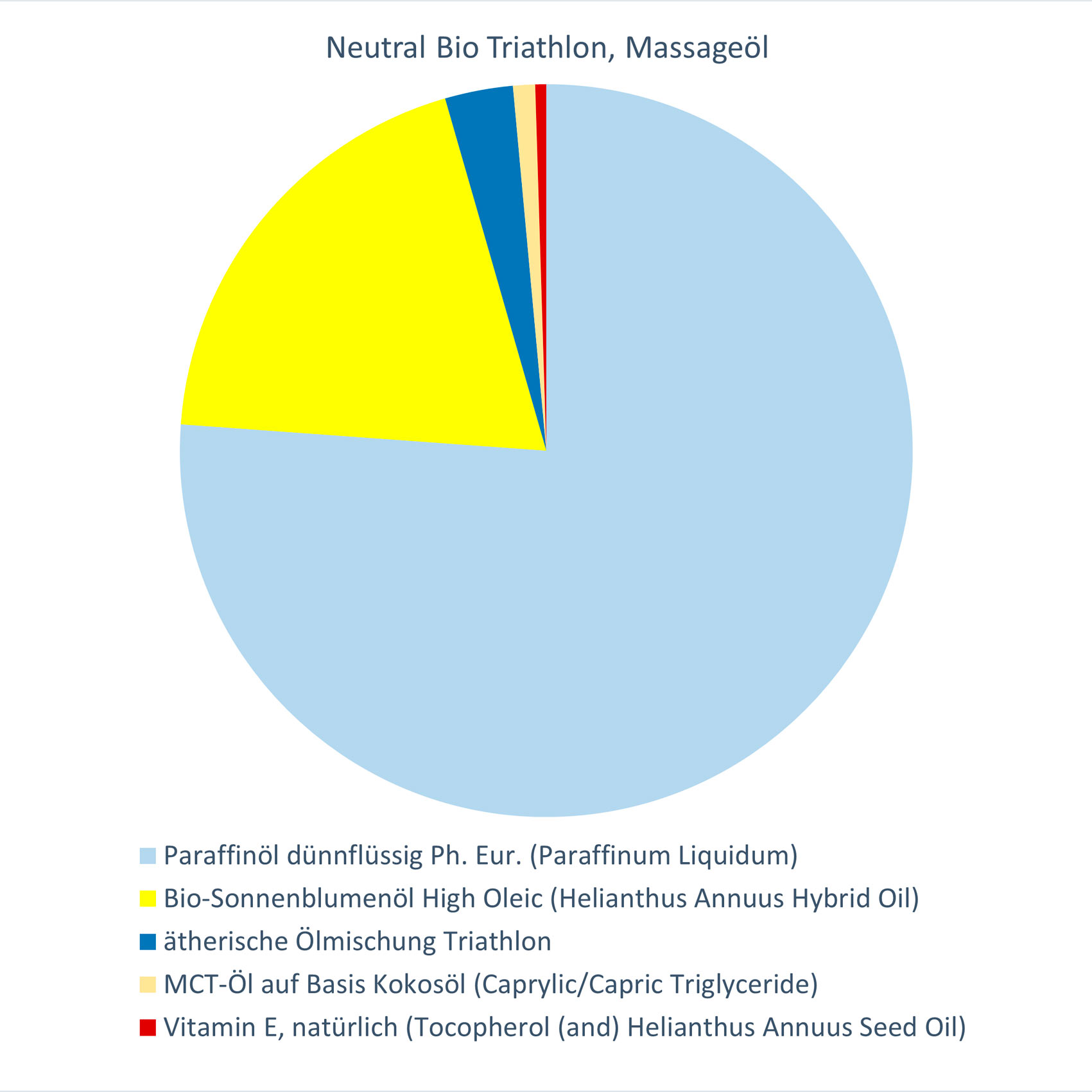 Inhaltsstoffe: Paraffinöl dünnflüssig, Bio-Sonnenblumenöl High Oleic, ätherische Ölmischung Triathlon, MCT-Öl, Vitamin E natürlich