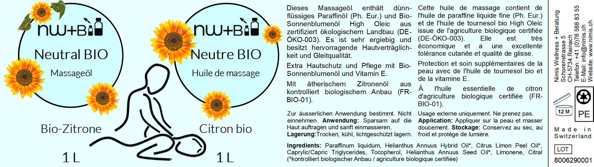 Dieses Massageöl enthält dünnflüssiges Paraffinöl (Ph. Eur.) und Bio-Sonnenblumenöl High Oleic aus zertifiziert ökologischem Landbau (DE-ÖKO-003). Es ist sehr ergiebig und besitzt hervorragende Hautverträglichkeit und Gleitqualität.