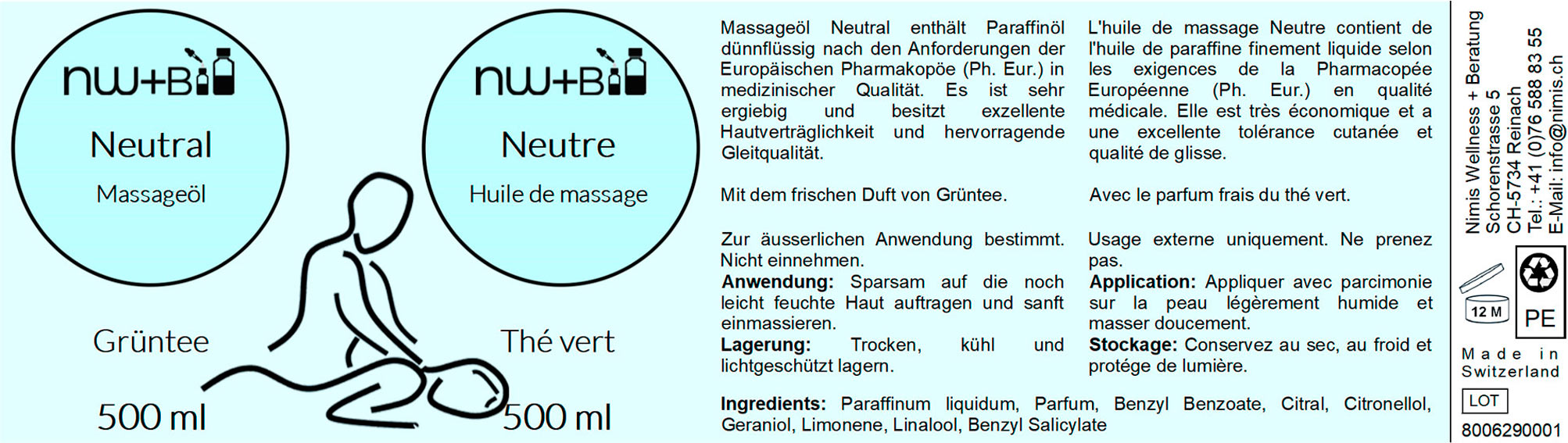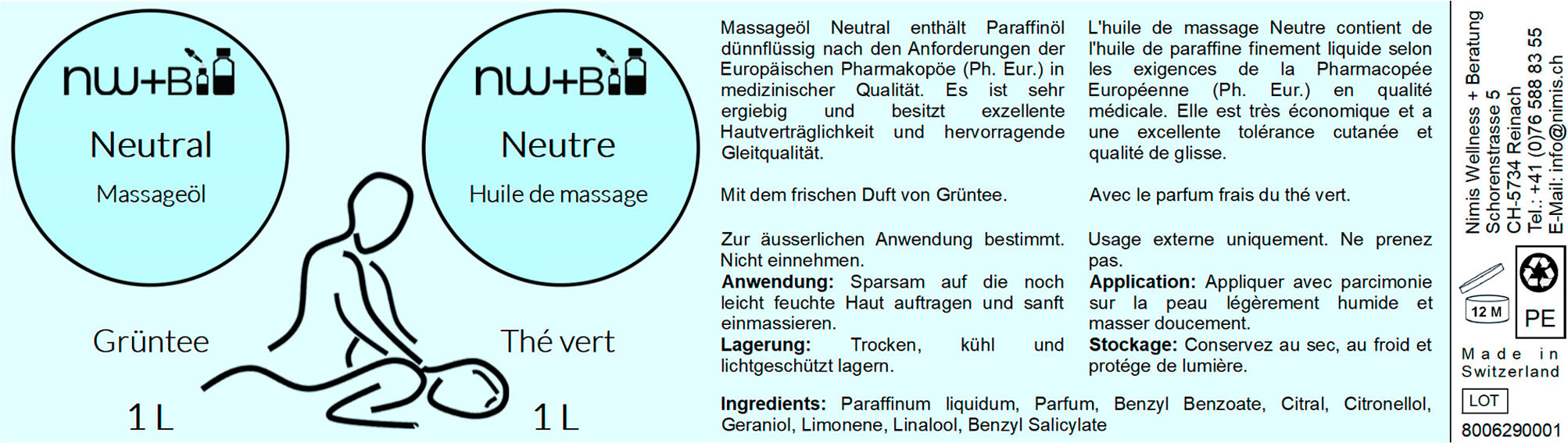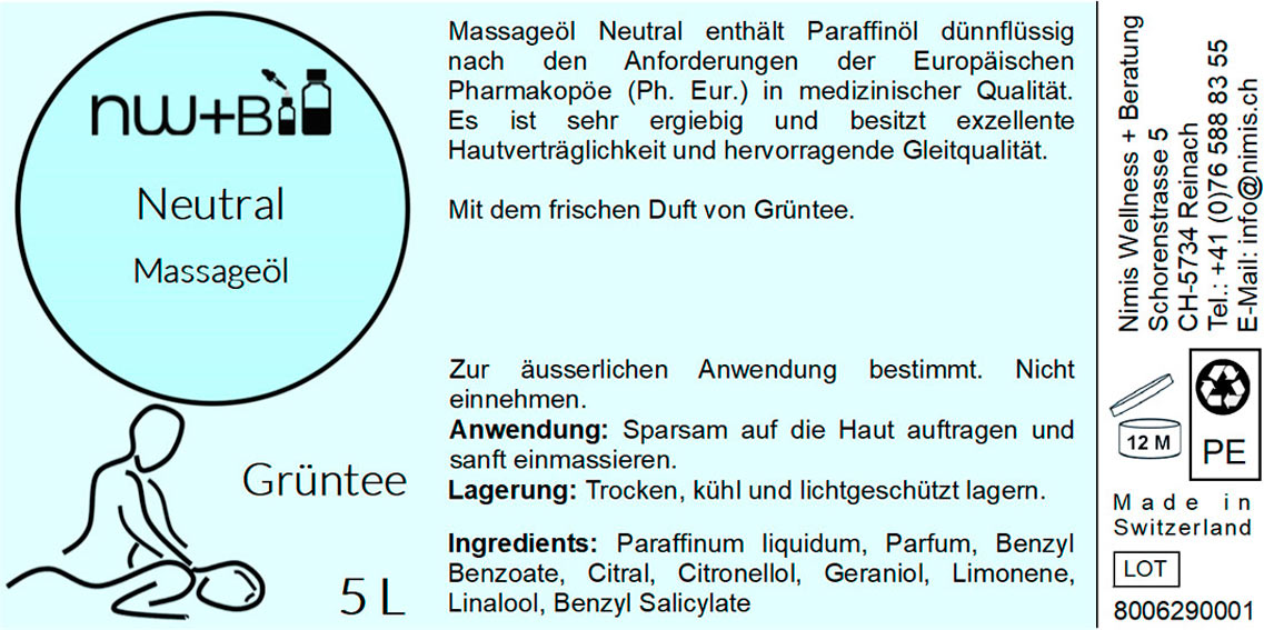 Das Massageöl Neutral Grüntee enthält Paraffinöl dünnflüssig nach den Anforderungen der Europäischen Pharmakopöe in medizinischer Qualität. Es besitzt exzellente Hautverträglichkeit, hervorragende Gleitqualität für Massagen und ist sehr ergiebig.