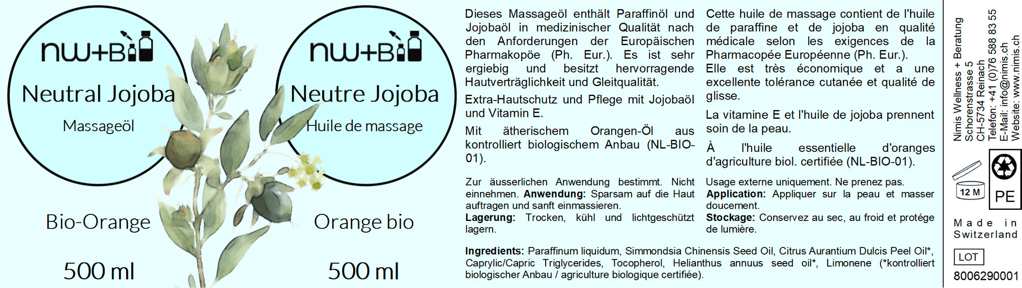 Dieses Massageöl enthält Paraffinöl und Jojobaöl in medizinischer Qualität nach den Anforderungen der Europäischen Pharmakopöe (Ph. Eur.) und des Deutschen Arzneimittelcodex (DAC). Als Massageöl ist es besonders ergiebig und besitzt hervorragende Gleitfähigkeit.