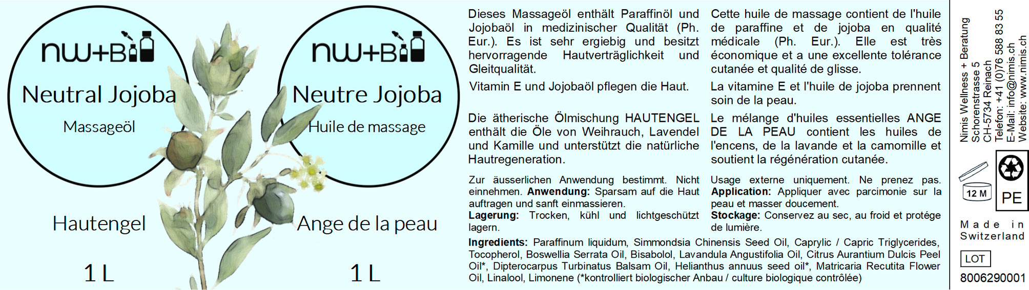 Das Massageöl Neutral Jojoba Hautengel enthält Paraffinöl und Jojobaöl in medizinischer Qualität nach den Anforderungen der Europäischen Pharmakopöe (Ph. Eur.) und des Deutschen Arzneimittelcodex (DAC). Als Massageöl ist es besonders ergiebig und besitzt hervorragende Gleitfähigkeit.