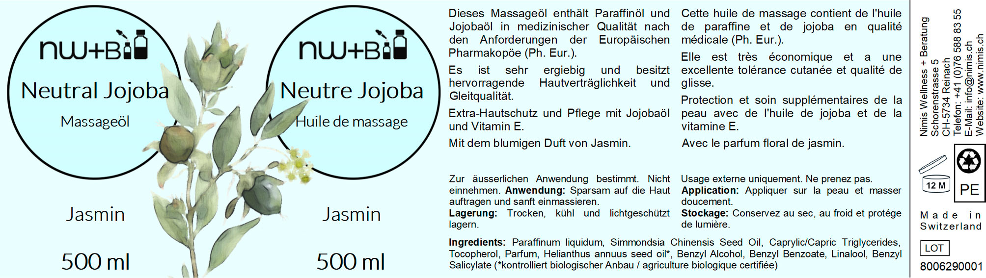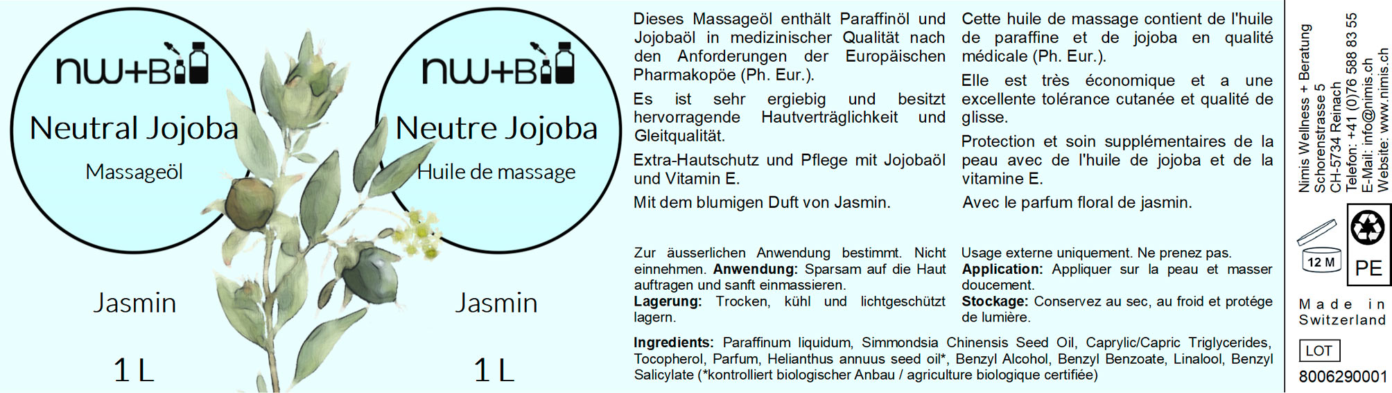 Inhaltsstoffe: Paraffinöl dünnflüssig, Jojobaöl, Jasmin-Parfümöl, MCT-Öl, Vitamin E natürlich