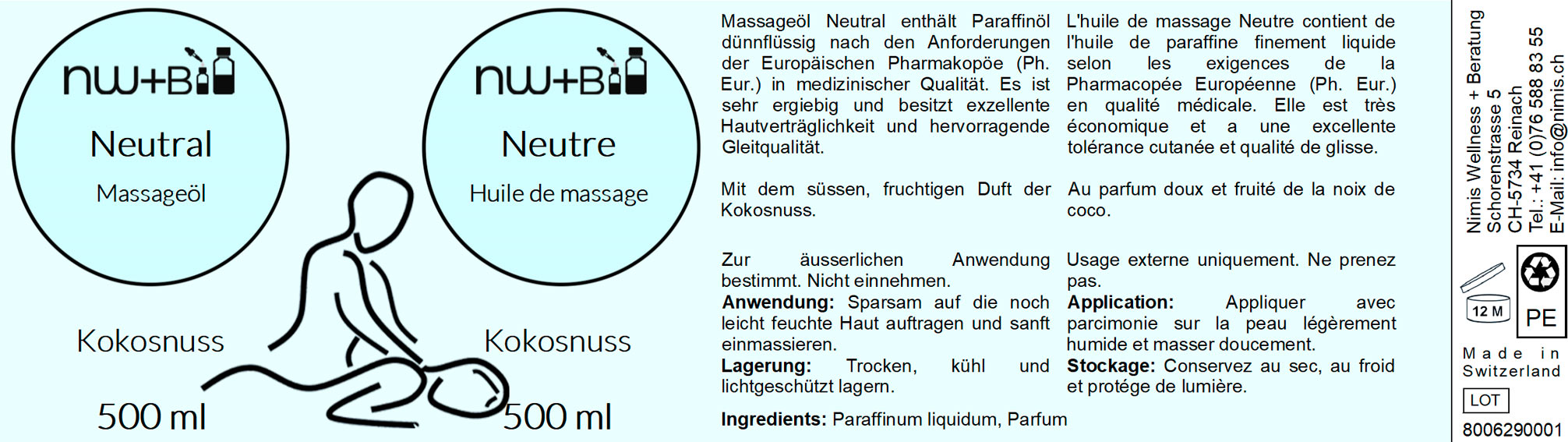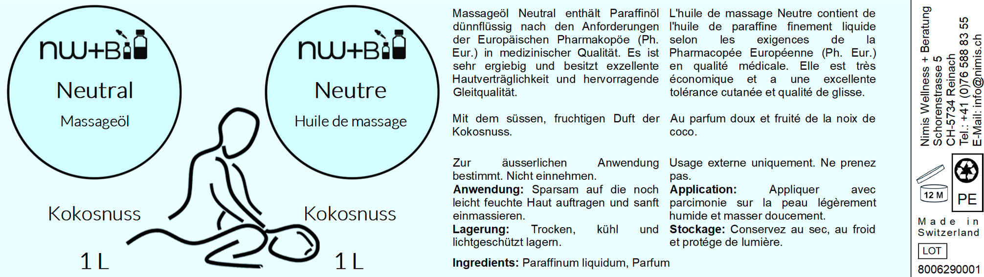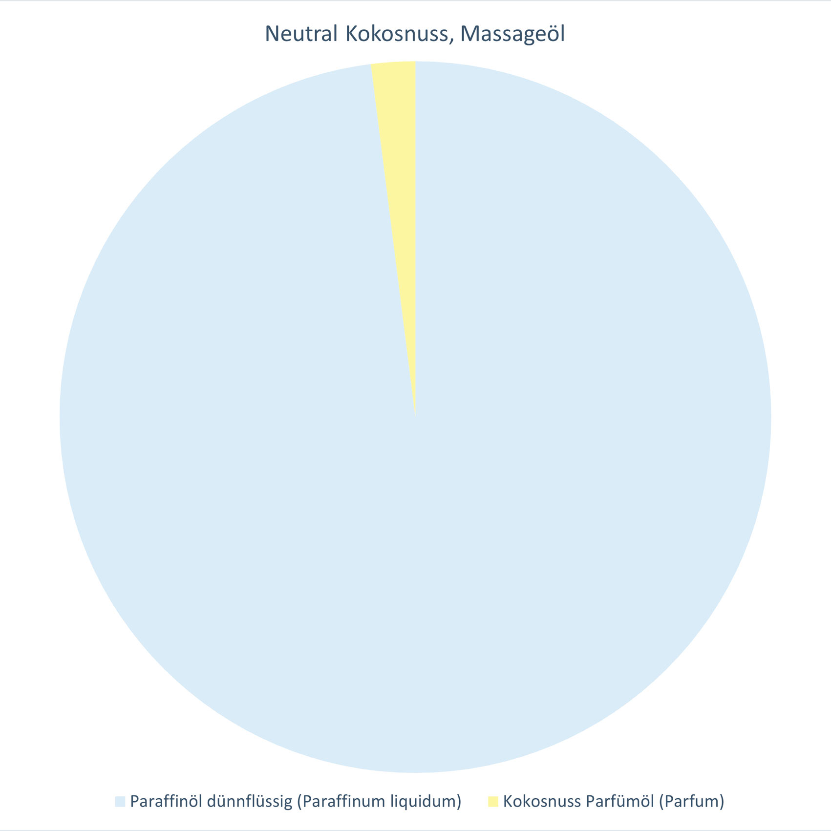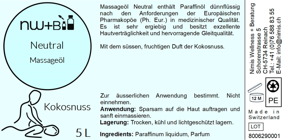 Das Massageöl Neutral Kokosnuss enthält Paraffinöl dünnflüssig nach den Anforderungen der Europäischen Pharmakopöe in medizinischer Qualität. Es besitzt exzellente Hautverträglichkeit, hervorragende Gleitqualität für Massagen und ist sehr ergiebig.