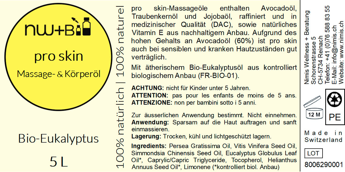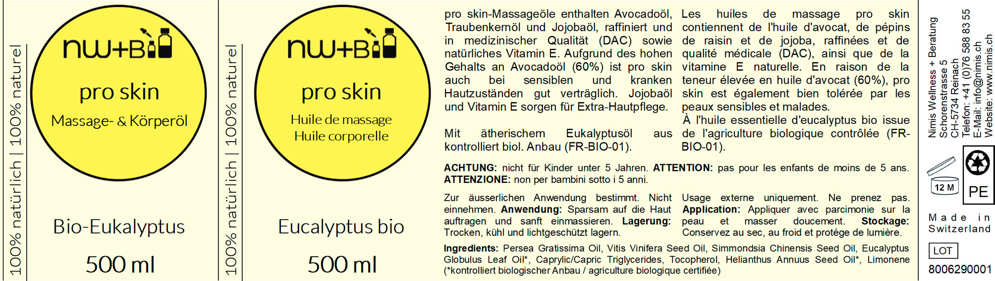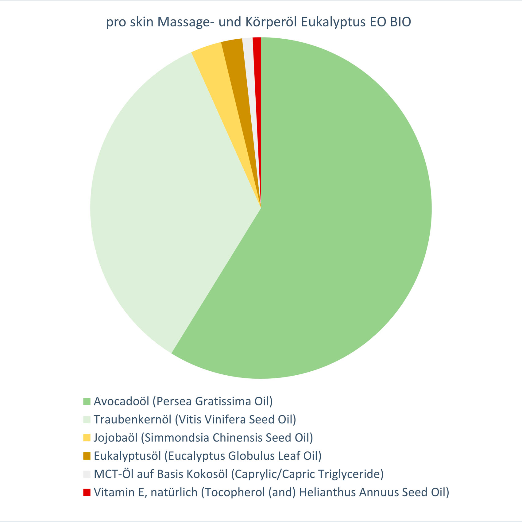 pro skin-Massageöle enthalten Avocadoöl, Traubenkernöl und Jojobaöl in medizinischer Qualität (DAC), sowie natürliches Vitamin E aus nachhaltigem Anbau.
