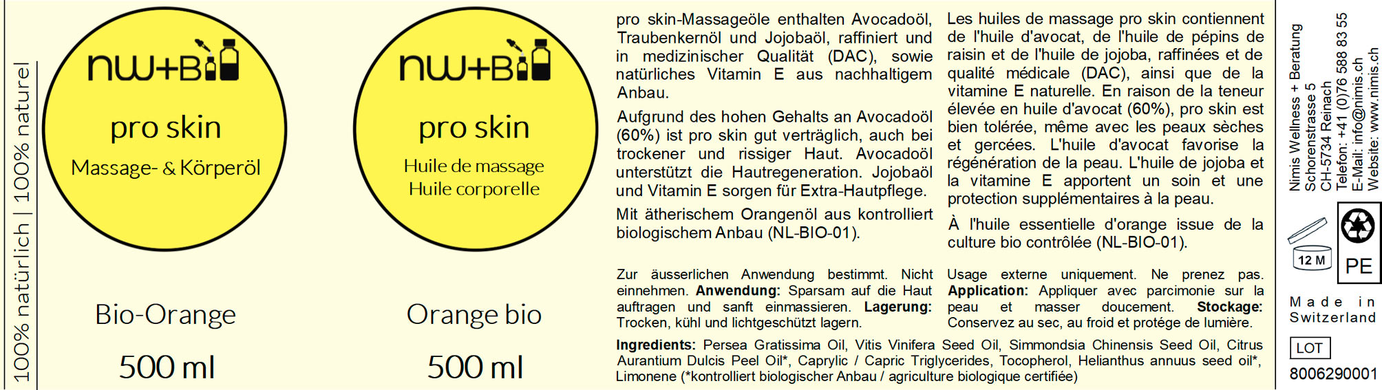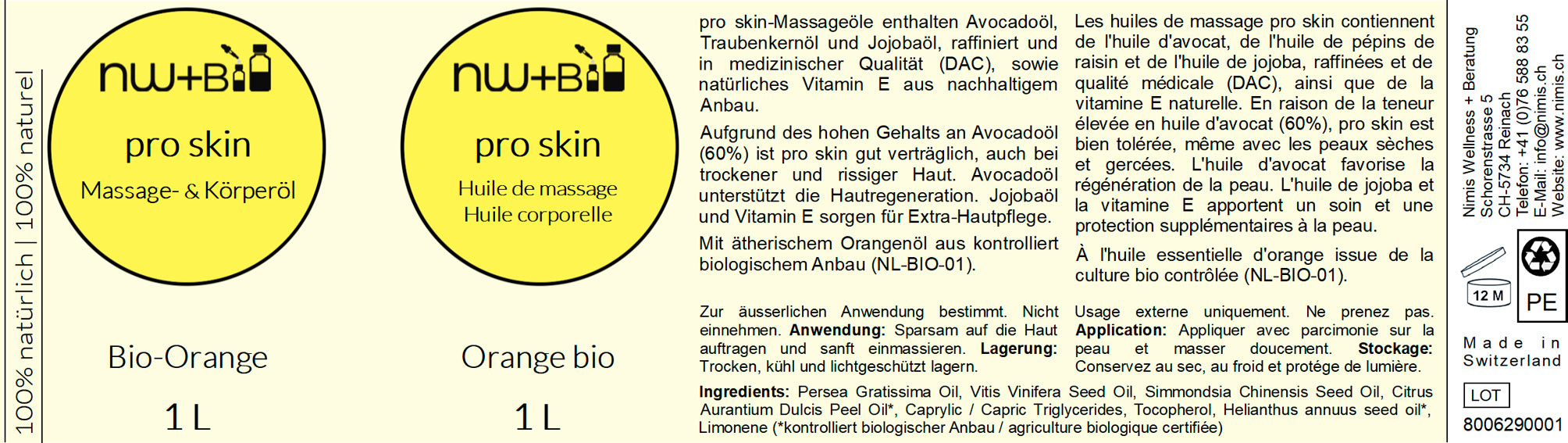 pro skin-Massageöle enthalten Avocadoöl, Traubenkernöl und Jojobaöl in medizinischer Qualität (DAC), sowie natürliches Vitamin E aus nachhaltigem Anbau.