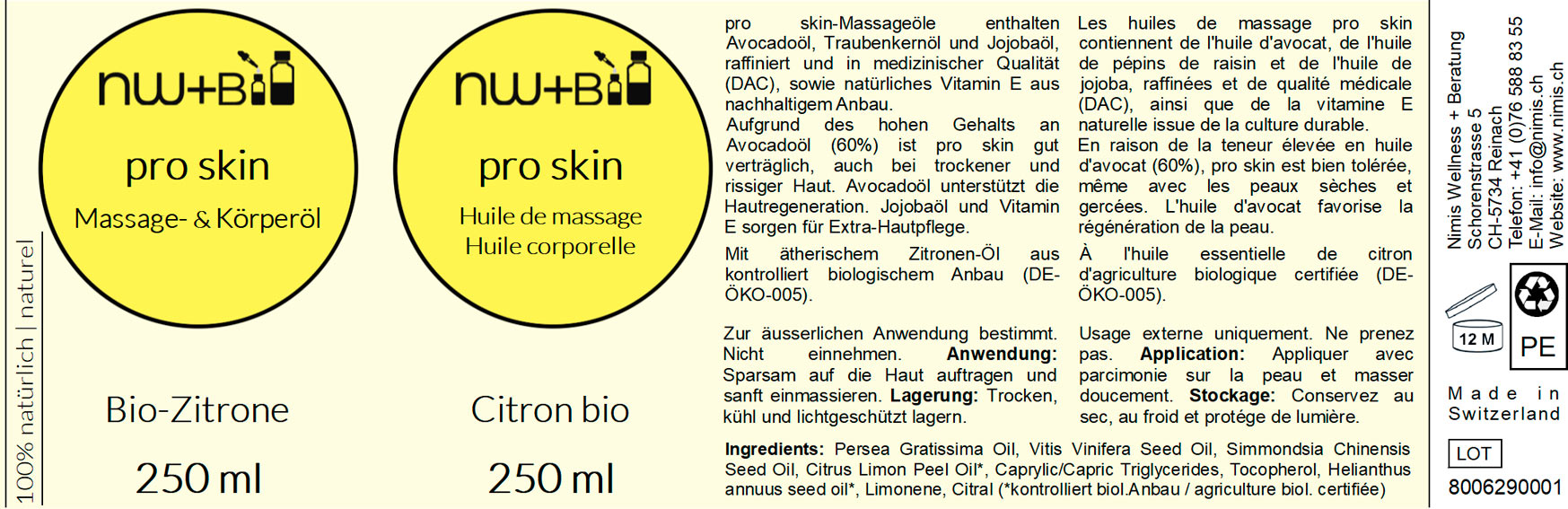 pro skin-Massageöle enthalten Avocadoöl, Traubenkernöl und Jojobaöl in medizinischer Qualität (DAC), sowie natürliches Vitamin E aus nachhaltigem Anbau.